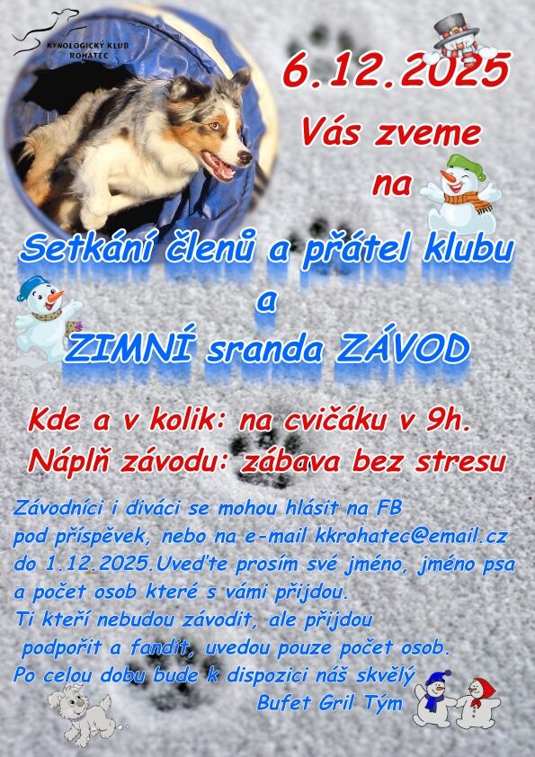 Plánované akce v roce 2025 17.5. Rohatecký koláček – dvojzkoušky agility - propozice a přihlašování zde 7.6. zkoušky – sportovka 13.9. Dětský den 5.10. O pohár obce Rohatec – závody sportovka 6.12. Zimní sranda závod a setkání členů našeho klubu 31.12. Silvestrovská vycházka 🐾🐶🐕🐩🐾🐶🐕🐩🐾🐶🐕🐩🐾🐶🐕🐩🐾🐶🐕🐩🐾🐶🐕🐩🐾🐶🐕🐩🐾🐶🐕🐩🐾🐶🐕🐩🐾🐶🐕🐩🐾🐶🐕🐩🐾🐶🐕🐩🐾🐶🐕🐩🐾🐶🐕 Proběhlé akce v roce 2024 11.5. - Rohatecké jumpingy (agility)